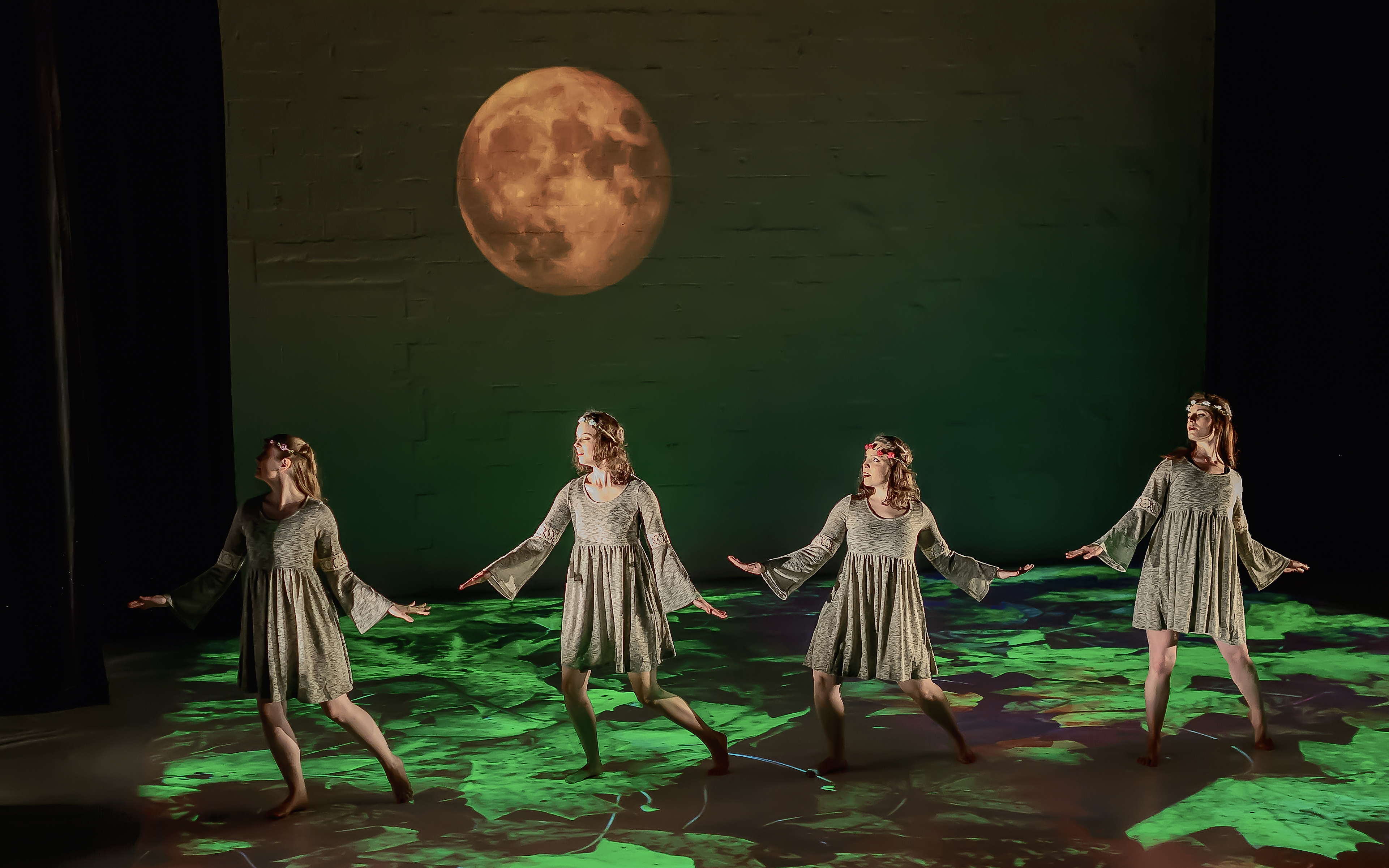 Dancers Grace Cannon, Emma Merlis, Sarah Raker and Jennifer De Ridder in Harvest Moon initially choreographed for NACHMODC. Harvest Moon was later performed as part of a triptych of works to John Lee’s original compositions. In this Dance Place Concert produced by Glade Dance Collective several wonderful art collaborations came to fruition. It was a wonderful show with abounding creative energy and a collaborative spirit, guest musicians and a remarkable design team whom made these dreamy nature inspired projections and beautiful lights.